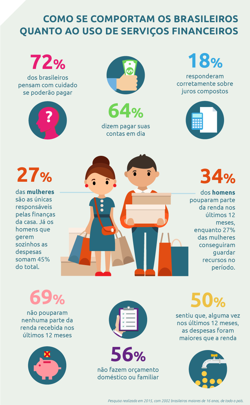 O relatório do BC, analisado na 5ª edição da Série Cidadania Financeira, avalia os resultados de pesquisa aplicada em 2015 em conjunto com a Serasa Experian e o Instituto Ibope. Foram avaliados o conhecimento, a atitude e o comportamento de 2.002 brasileiros com mais de 16 anos, de todas as regiões do país, quanto ao uso de serviços financeiros.