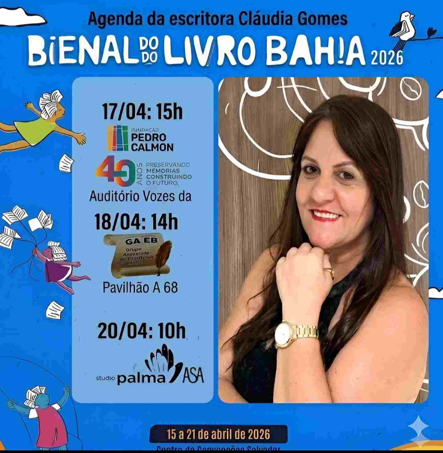 AFL, também integra a programação da Bienal. No dia 18 de abril, ela lança o livro infantil ‘Milena e o Lápis de Cor’, além de participar de atividades com o público. Com uma carreira que articula literatura, educação e formação de leitores, Cláudia tem papel relevante na difusão da leitura em diferentes espaços.