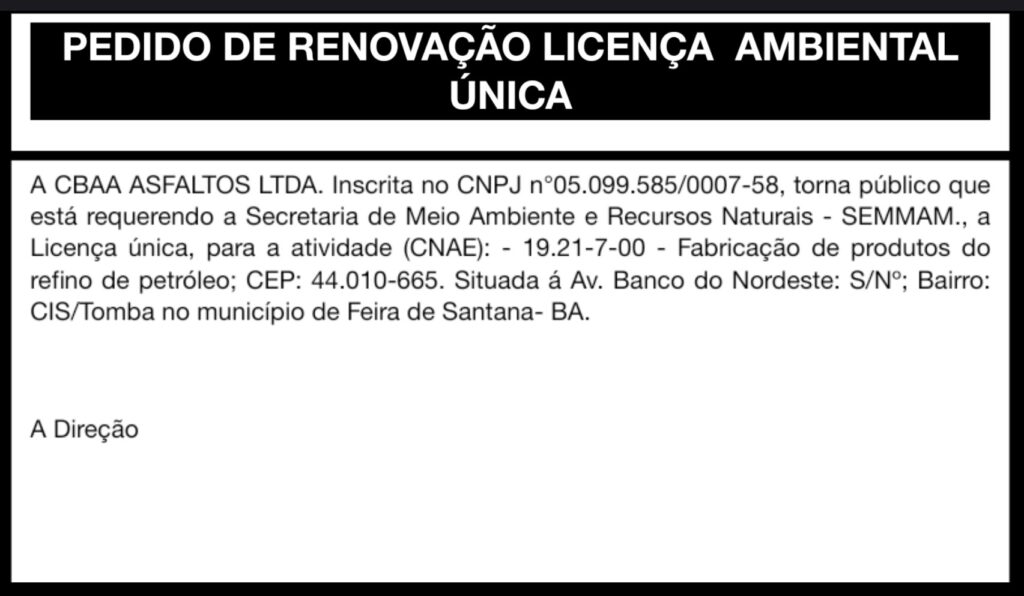 Institucional 3 de dezembro de 2025 Feira de Santana, 3 de dezembro de 2025 Disponível em: https://feirahoje.com.br/cbaa-afaltos-ltda-pedido-de-renovacao-da-licenca-ambiental/