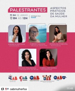 A programação inclui palestras com as advogadas Andreza Santana e Monalisa Pimentel, e com a médica obstetra Carmen Silvana. A mediação será feita por Carolline Gomes e a presidência da mesa ficará a cargo de Mônica Malaquias.