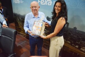 Durante a coletiva de imprensa realizada nessa terça-feira (12) para apresentar a estrutura da Expofeira 2025, um momento paralelo ao tema central ganhou destaque. O prefeito José Ronaldo de Carvalho recebeu a pró-reitora de Extensão da Universidade Estadual de Feira de Santana (Uefs), Taise Bomfim, com quem conversou sobre a Feira do Livro/Festival Literário e Cultural de Feira de Santana (Flifs). O encontro, registrado no final da tarde na Prefeitura, evidenciou o peso cultural do festival para a cidade.