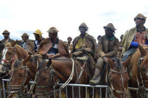 O que seria elogiável, o fato de o homem, enquanto parado, procurar apoiar  seu corpo, descansando das lidas e labutas, é visto como uma postura negativa, um defeito moral… e, quando montado, se encontrando um companheiro com quem possa trocar dois dedos de prosa, descansar uma perna sobre a “espenda da sela” e relaxado, ciente da docilidade da sua montaria em quem tem plena confiança, e somente por isso podem relaxar um momento que deve ser bem usufruído, pitam um cigarro de palha, comentam sobre o tempo, auscultam  se existem sinais de chuva, trocam informações sobre conhecidos, buscam conhecimentos e saberes sobre a vida cotidiana, uma rês perdida, quem daria notícia?  Urubus não estão à vista, um ou outro apenas sozinho, sinal de que morta a criatura não está. Porque notícias da política nacional, ah! isto nem é motivo para se estragar um dedo de prosa, uma boa tragada de um cigarro na garganta umedecida pela saliva grossa, tanto tempo sem refresco de água ou uma boa caninha. Pobre Euclides…só conhecia as montarias do Jockey club, onde o cavalgar é outro desfile em espaços racionalmente planejado… Na imagem abaixo, podemos ver vários vaqueiros, de diferentes idades, relaxados, bem à vontade em suas mansas montarias, aguardando o sinal para retomar as atividades. Enquanto esperam, conversam, fumam, divagam, relembram, fantasiam, sonham…como todos os homens do mundo…