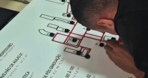 Além da função inclusiva, o projeto reforça o compromisso com a sustentabilidade. O mapa foi confeccionado em acrílico branco, em escala 1:500, com caminhos em relevo e nomes em braille e alfabeto comum. Para reduzir custos e evitar descartes, a equipe reaproveitou resíduos eletrônicos na montagem do protótipo.