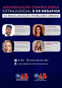 A Comissão de Direito Imobiliário da OAB Feira de Santana realiza, nesta terça-feira (27), das 14h às 18h, palestra sobre ‘Adjudicação Compulsória Extrajudicial e os Desafios na Regularização Imobiliária Urbana’, na sede da instituição.